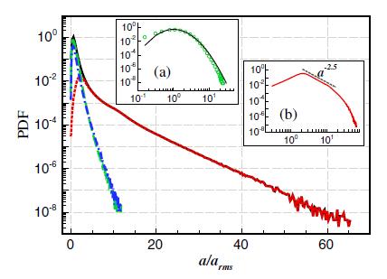 Right: Different PDF distribution of acceleration in different flow region.