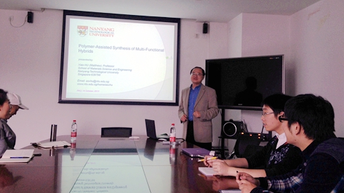 On Oct. 14, invited by Professor Haifeng Yu of the Department of Materials Science and Engineering (MSE), College of Engineering, Xiao Hu of Nanyang Technological University visited MSE and gave a lecture entitled “Polymer-Assisted Synthesis of Multifunctional Hybrids: Hidden Potential”. Dozens of teachers and students from MSE, University of Science and Technology Beijing, and Institute of Process Engineering of Chinese Academy of Sciences attended the lecture.