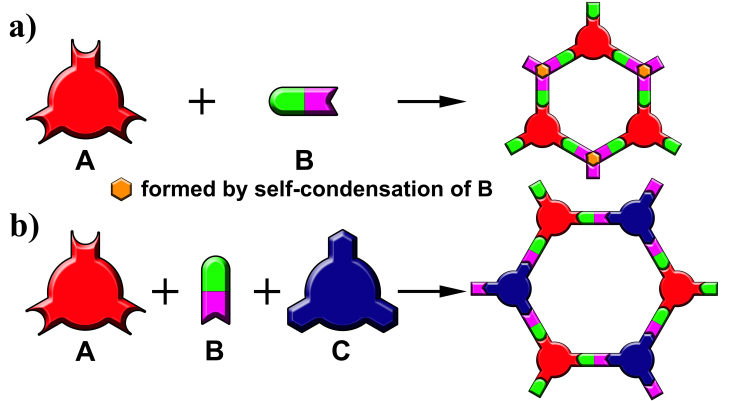 Professor Zou’s team put forward a new strategy. By using a novel orthogonal reaction strategy, they rationally designed and successfully constructed COFs with the formations of two types of covalent bonds in only single step. The protocol was applied to construct not only binary COF but also more complicated ternary COF. It is notable that the conventional step-by-step methods cannot be validated to the two COFs. The reaction mechanism for the formations of COFs was investigated and revealed the parallel formations of two types of bonds that be concurrently accompanied by the crystallization of COFs. This strategy presents a new idea for designing novel COFs and will broaden greatly the scope of the COFs materials.