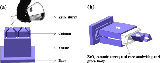 Fig. 1. The flow chart of the gelcasting process of the ZrO2 ceramic corrugated core sandwich panels: (a) gelcasting; and (b) demoulding.