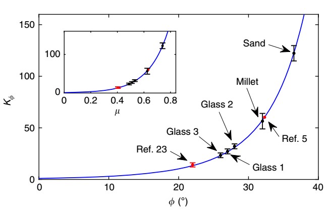 Figure 2. Left: Dimensionless pressure–depth curves for the different granular materials (glass beads, millet and sand). Right: Theoretical prediction of k?.