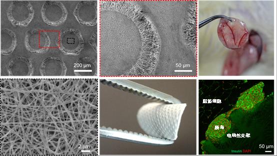 Left and middle: Electrospun scaffolds and micro-wells structure; the upper right: vascularized cell graft; the lower right: the stent-assembled islets survive in the body and function.
