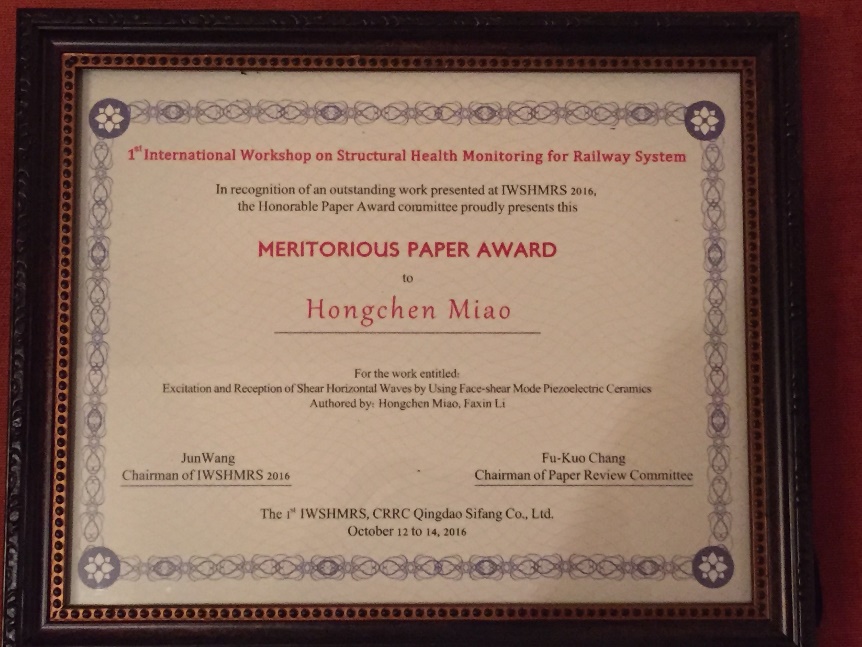 This work had been paid more attention to and highly appreciated by scholars in the field of NDT/SHM. On the 1st International Workshop of Structural Health Monitoring for Railway System (Qingdao, China, Oct.12-14, 2016), this work was granted with the Meritorious Paper Award (first prize). The Chairman of the Review Committee is Prof. Fu-Kuo Chang, Stanford University, who is also the Editor-in-chief of the international journal Structural Health Monitoring. The committee includes Prof. Peter Cawley, Fellow of Royal Society and Fellow of Royal Society of Engineering, head of Mechanical Engineering, Imperial College, and other renowned scholars in NDT/SHM. The Chair Professor M. Ruzzene at Aerospace Engineering, Georgia Tech Inst appraised this work to be “very good, very important”.