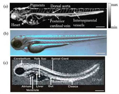 Zebrafish is one of the most important animal models for developmental study and disease research. Traditional microscopic imaging methods generally require the fluorescence labeling to achieve high-contrast images. Based on zebrafish tissue's intrinsic optical absorption property, Li’s lab accomplished the label-free in-vivo high resolution imaging of whole body circumlocutory system of zebrafish larva. This method can be implemented in research of other animal models, providing a powerful new imaging method for life science and preclinical medicine research.