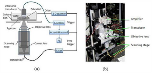 The following figure shows the photoacoustic microscopy (PAM) system developed in Li's lab. This system obtains high resolution by optical focus and high contrast by detecting the ultrasonic waves through photoacoustic effect.