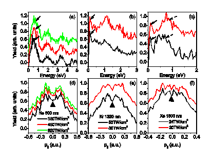 Low energy photoelectron energy spectra and longitudinal momentum distributions of Ne ((a) and (d)), Kr ((b) and (e)) and Xe ((c) and (f)) in infrared laser fields.