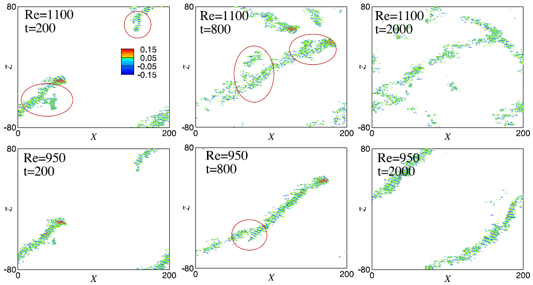 III. The interaction between bands may lead to band breaking and decay when 1000>Re≥665. With the increase of Re, band split occurs and produces band ‘seeds’ (Fig.2). The turbulence spreading caused by oblique extension and band split is found to overcome the decay process when Re>1000. As a result, the temporally sustained turbulence is obtained eventually.