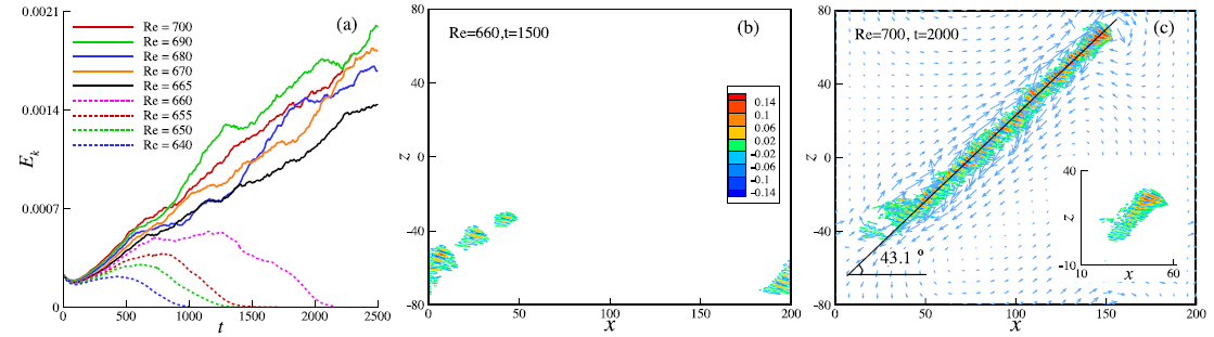Fig.1 (a) Kinetic energy of disturbance, (b) turbulent band breaking, (c) oblique extension of turbulent band. The inset of (c) shows the band ‘seed’ used as initial disturbance. The iso-contours of the transverse velocity and the vector field of mean flow in the plane parallel to the walls are shown as well.