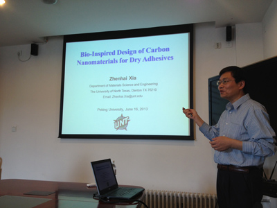 On June 17, invited by Professor Haifeng Yu of the Department of Materials Science and Engineering (MSE), College of Engineering, Associate Professor Zhenhai Xia of the University of North Texas visited MSE and gave a lecture entitled “Biomimetic Design of Carbon Nanomaterials for Dry Adhesives”. Dozens of teachers and students from MSE, Tsinghua University, University of Science and Technology Beijing, and Institute of Chemistry of Chinese Academy of Sciences attended the lecture.