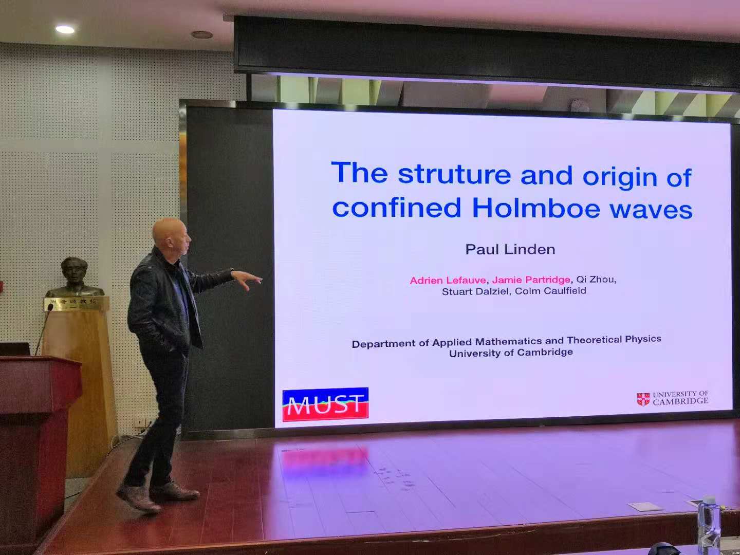 On October 26th, Prof. Linden gave a seminar at the LTCS, titled “The structure and origin of combined Holmboe waves”. In this talk, Prof. Linden introduced the origin of an unreported long-lived coherent structure in a laboratory stratified shear flow generated by exchange flow through an inclined square duct connecting two reservoirs filled with fluids at different densities. Through experiments, measurements and analysis, they finally come to a conclusion that the lateral confinement is an important ingredient of the confined Holmboe instability, with implications for many inherently confined geophysical flows such as in valleys, estuaries, straits or deep ocean trenches.