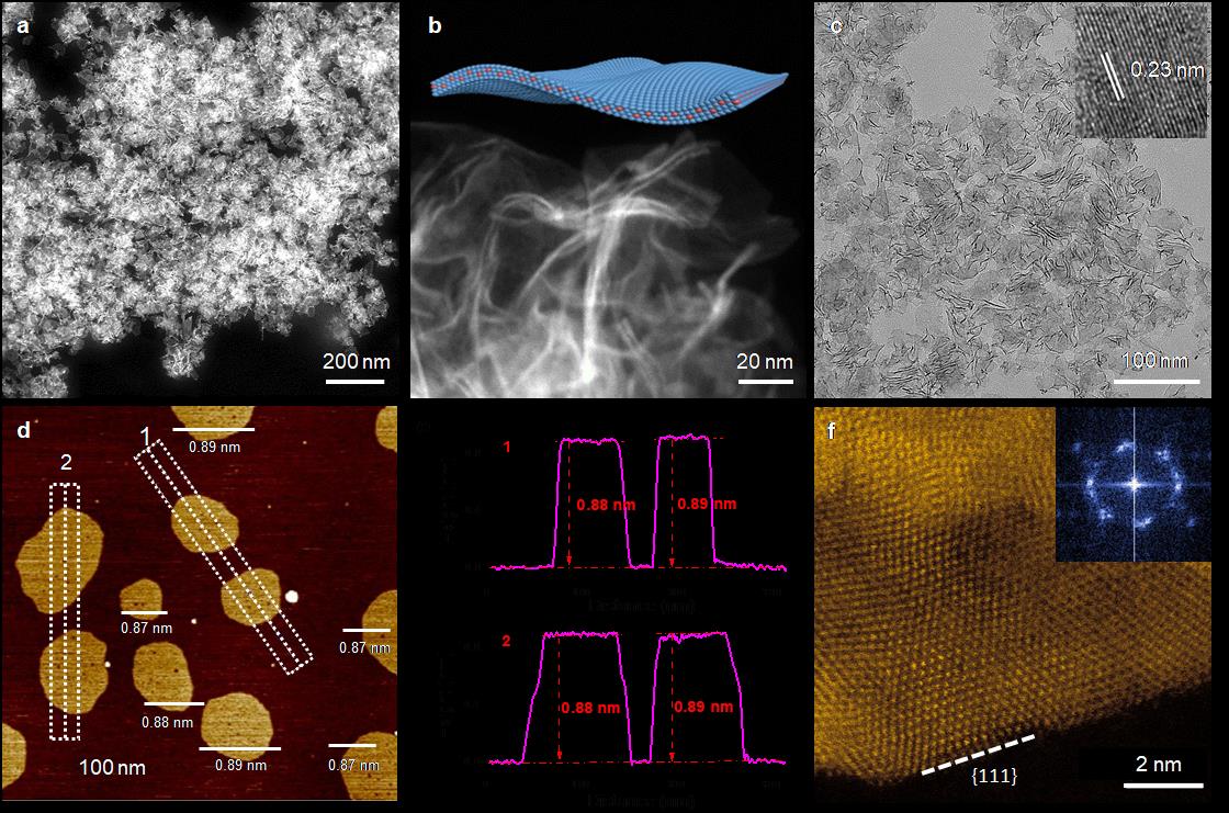 Fig. 1. Structural characterizations of PdMo bimetallene. a–c, Low-magnification HAADF-STEM (a), high-magnification HAADF-STEM (b) and TEM (c) images of PdMo bimetallene. The inset of c shows an HRTEM image of PdMo bimetallene. d, e, AFM image (d) and corresponding height profiles (e) of PdMo bimetallene. f, High-resolution HAADF-STEM image taken from a single bimetallene nanosheet. Inset, the corresponding fast Fourier transform patterns.