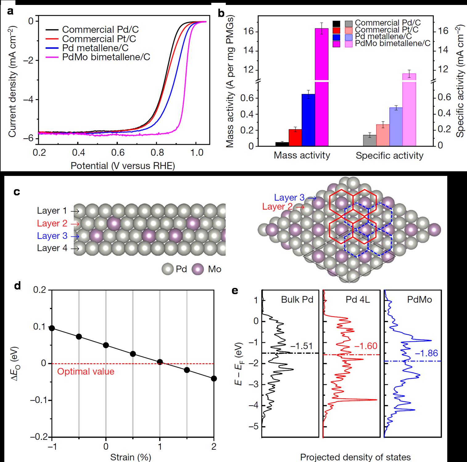 Fig. 2. Electrocatalytic performance and mechanism study. a, b, ORR polarization curves (a) and a comparison of the mass- and specific activities (b) of the stated catalysts in 0.1 M KOH at 0.9 V versus RHE. c, Left, side view of the atomic model of the four-layer PdMo bimetallene. Right, top view of the atomic model showing layers 2 and 3. In layers 2 and 3, each molybdenum atom is surrounded by six palladium atoms, indicated by the red (layer 2) and blue (layer 3) hexagons. d, Oxygen binding energy (ΔEO) of PdMo bimetallene as a function of compressive (negative) and tensile (positive) strains. The horizontal red line indicates the optimal ΔEO value. e, The projected electronic density of states of the d-band for the surface palladium atoms in bulk Pd, a four-layer Pd sheet (Pd 4L) and PdMo. The horizontal dashed lines indicate the calculated d-band centre.