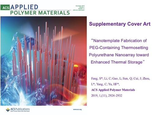 In previous collaborative studies, a series of solid−solid phase-change material (SSPCM) of thermoset-ting polyurethane (TPU) nanoarrays were successfully fabricated by in-situ polymerization of poly(ethylene glycol) (PEG)-containing macromonomers in nanoporous alumina (anodized aluminum oxide, AAO) templates. The PEG segments act as heat storage units. The PEG blocks were oriented partly by the nanoconfinement in the AAO nanotemplates, leading to a higher melting point and an enhanced heat storage capacity. (ACS Applied Polymer Materials 2019, 1,(11), 2924-2932, Supplementary Cover Art)