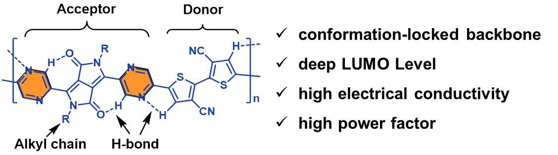 In recent years, with the emergence of various building blocks, the carrier mobilities of D-A type conjugated polymers have been significantly improved. Among them, diketopyrrolopyrrole (DPP) is a type of structural unit that has received wide attention. Currently, DPP-based D-A conjugated polymers reported in the literature have shown electron mobilities over 5 cm2/V s. This value is even higher than the hole mobilities of p-type conjugated polymers. However, the conductivity of n-doped DPP conjugated polymers is usually low (0.1 - 1 S/cm), which is mainly caused by the low n-type doping efficiency of such polymers.