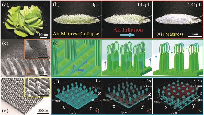 Figure 1. (a), (b) Nature Salvinia molesta and the liquid-gas interface on its leaf surface. (c), (d) Unique structures on the Salvinia leaf surface and schematics of the stable liquid-gas interface. (e), (f) The biomimetic artificial Salvinia surface and the liquid-gas interface on its surface.