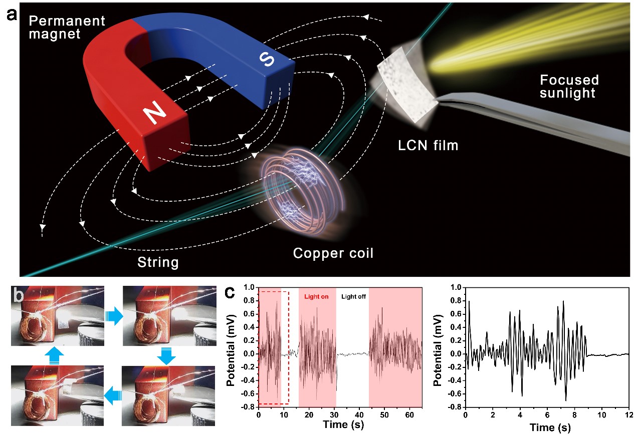 Owing to over 50 % NIR irradiation in solar spectrum, PDA-coated film was found to oscillate upon exposure of focused sunlight. A novel solar power generation device was designed and fabricated. It proves that the novel sunlight-driven oscillator is capable to motivate the power generation device, successfully transferring the solar energy to electricity (Figure 3). This work provides a versatile strategy to fabricate NIR-light-actuated polymeric oscillators, providing inspirations in the development of biological soft robots and advanced biomimetic devices.