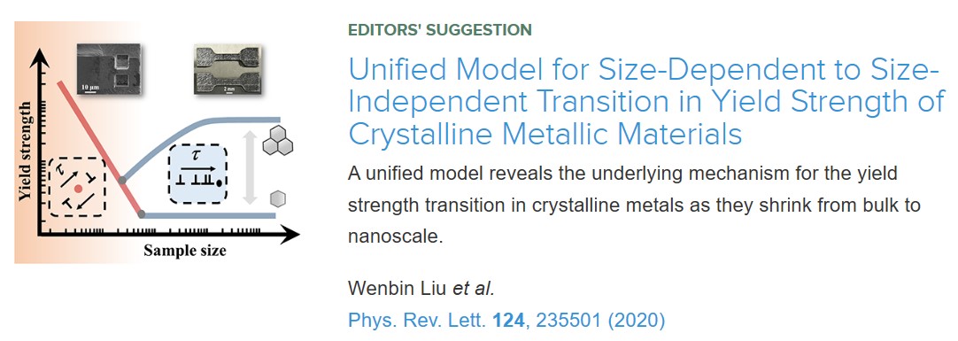 This research work was published in Physical Review Letters in the form of "Editors’ Suggestion" on June 9, 2020, entitled“Unified Model for Size-Dependent to Size-Independent Transition in Yield Strength of Crystalline Metallic Materials” [Phys. Rev. Lett. 124, 235501, (2020)].