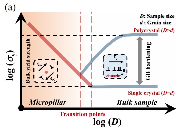 Recently, Huiling Duan’s group from College of Engineering, Peking University, found that the transition from size-dependent to size independent yield strength of crystalline metallic materials is controlled by the competition between the stresses required for dislocation source activation and dislocation motion. Moreover, the classical Hall–Petch relation was extended to the micro-size polycrystals based on the evolution of grain boundary (GB) density. On this basis, a unified model that could characterize the yield strength for crystalline metallic materials with sample size from microscales to macroscales is established.