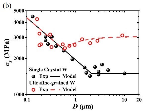 This proposed model successfully interprets the physical mechanism of the yielding of miniaturized crystalline metallic materials, and reveals the internal connection between yield strength and sample size. Various reported experimental results have been accurately captured by this unified model, including the pre-strained nickel, irradiated copper, ultrafine grain tungsten (Fig. 2), and so on.