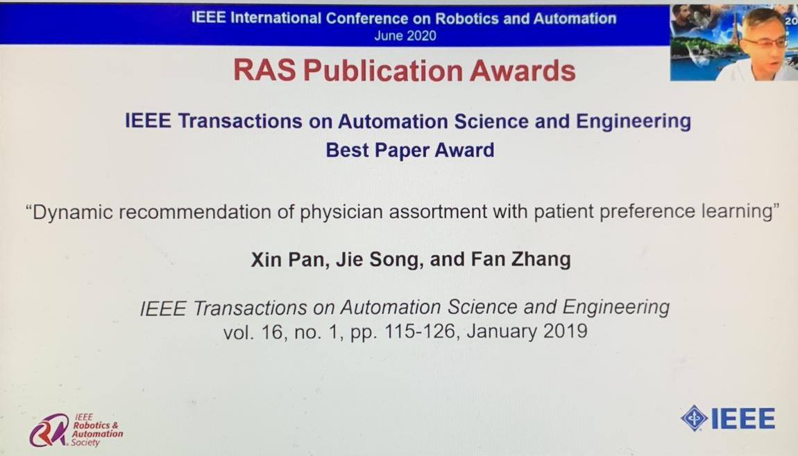 Recently, a paper entitled “Dynamic Recommendation of Physician Assortment with Patient Preference Learning” published on IEEE Transactions on Automation Science and Engineering (IEEE T-ASE) won the prestigious 2020 IEEE T-ASE Best Paper Award. The authors are Dr. Xin Pan who graduated from the College of Engineering, Dr. Jie Song, Associate Professor, and Ph.D. student Fan Zhang from the Department of Industrial Engineering and Management, College of Engineering. The award, which recognizes the best paper of the IEEE T-ASE published in the year of 2019, has been announced and presented at the annual 2020 IEEE Conference on Robotics and Automation (ICRA) on June 6th, 2020.