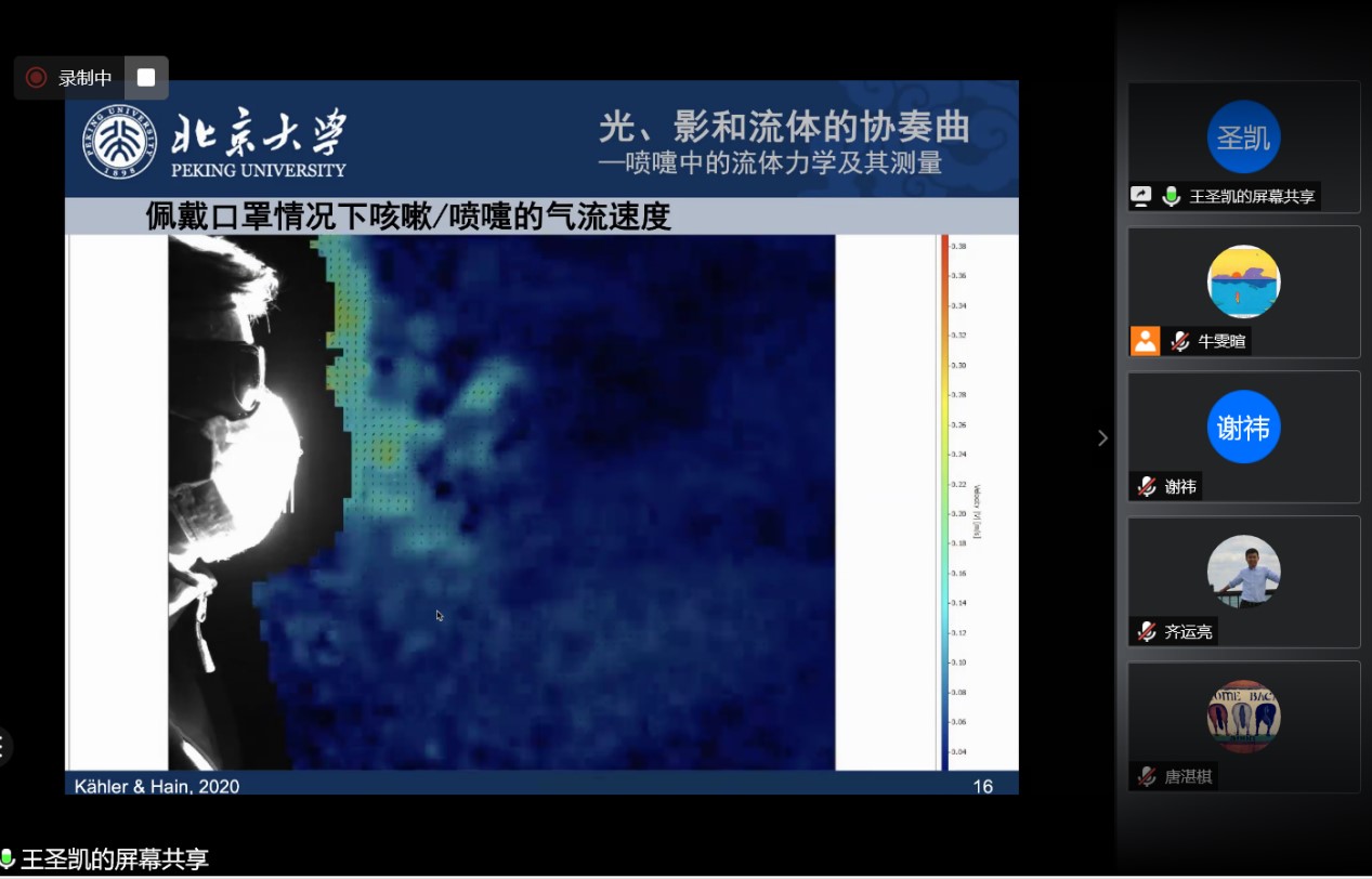 In the third talk, Assistant Prof. Shengkai Wang discussed a small problem in daily life related to turbulence, namely fluid mechanics in sneezing. He introduced some wonderful optical measurement techniques in contemporary fluid mechanics research. He showed an animation of people sneezing without wearing a mask and wearing a mask, showing the audience the different fluid movement under the optical measurement of the flow field.